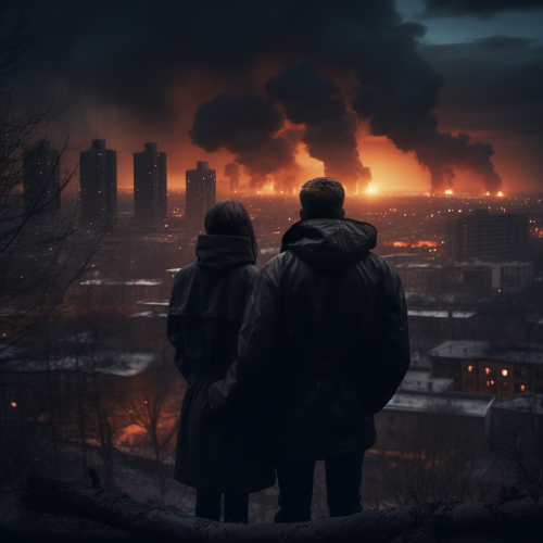 8k image of two lovers from behind while holding hands looking at a war scenario during the 80s in a city. The man wears a black coat