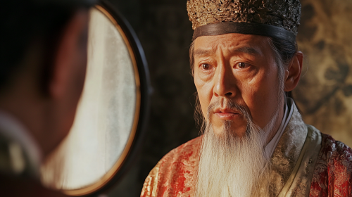 Claro, aquà tienes la traducción al inglés: Traditional Chinese man looking at himself in the mirror, with a doubtful expression. in a --ar 16:9 --v 6.1