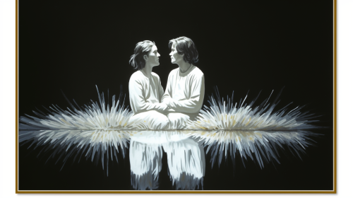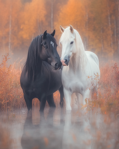 Create a beautiful moment in the early morning, a symphonic dance in the morning mist, two horses, one black and the other white, in a quadrille, the surroundings are beautiful Nordic nature in warm autumn colors, a full body portrait inspired by Man Ray's visionary photography, --ar 4:5 --p teqj53c --s 500