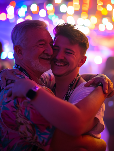 cinematic photograph of a young man and his dad, dancing close at a disco, lanyards and tickets hanging past their chests, hugging real happy, disco lights and neon --ar 3:4 --v 6.0