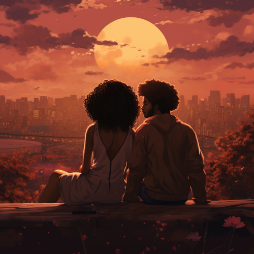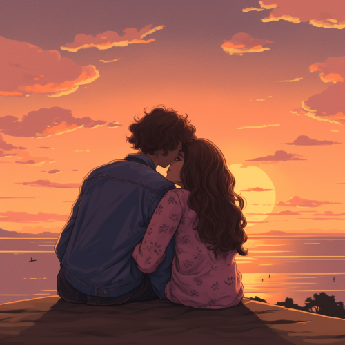 lofi aesthetic album cover, the last time two lovers saw each other, distance between two lovers, praying to get back to each other, man with straight hair, woman with poofy brown curly hair, watching the sunset together