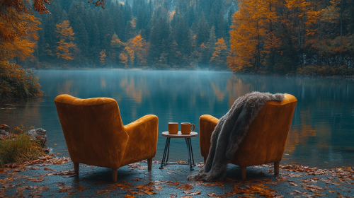high quality 8k photo, two luxury cats are standing side by side with their backs facing, the cats are facing the lake, the lake is very calm, fresh and peaceful, and the forest is visible behind the lake. The season is autumn and each of the lush leaves in the forest resembles autumn colors with red, orange and yellow leaves. There is a small coffee table in the middle of two chairs. On the table there are 2 luxury mugs filled with hot chocolate. A fluffy blanket hangs from one of the chairs to the floor --ar 16:9 --stylize 750
