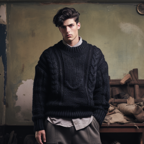 Male lookbook photo in the style of Visvim wearing a cropped wool rugby knitted jumper in black, on backdrop, standing full body, high quality, photorealistic