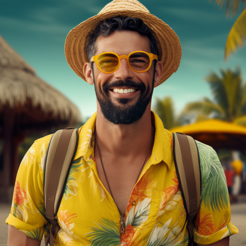 caucasian brazilian man, advertising picture, with vacations vibe, yellow details, joão canziani style, 50mm, 16:9