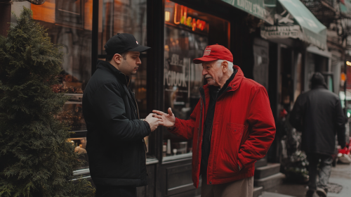 a man in all black asking an old new york man in all red, close up shot chest up of the men both standing up, behind is a simple restaurant with minimalstic vibes and some green in New York, during the middle of the day --ar 16:9