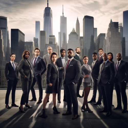 A dynamic and diverse group of business professionals, representing various industries and backgrounds, stands confidently in a V-formation, with the leader at the front. Each individual is dressed in sharp, modern business attire, exuding success and professionalism. Behind them, expansive floor-to-ceiling windows showcase the iconic New York City skyline, featuring recognizable landmarks like the Empire State Building and the towering skyscrapers of Manhattan. The atmosphere is sleek and sophisticated, with natural light flooding the space, highlighting the group’s unity and ambition. The scene is captured in a photorealistic style, emphasizing the fine details of the office setting, their expressions of determination, and the vibrant cityscape beyond. --v 5.0