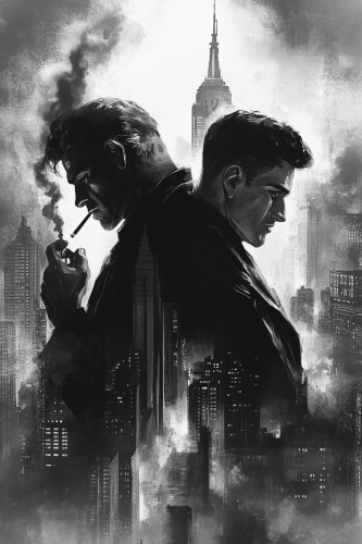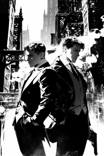 a cover for a noir novel; black-and-white illustration; smoky-steampunk New York background; 1931; with, in the center of the image, on 2/3, two full-length men, back-to-back; both men are handsome, one is thrity-something years old and the other one is twenty years old; black-and-white illustration; --ar 2:3 --niji 6