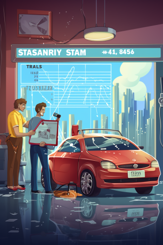 A car wash business with two men cleaning the shiny car, with a TV in the back that shows statistics going up, 4k, --ar 2:3