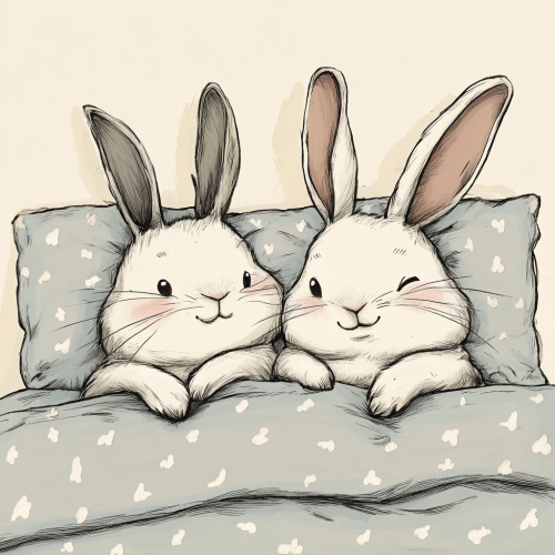 Two cute cartoon bunnies lying in bed, illustrated by Sharpie, bold black lines and solid colors, simple details, minimalism, Sharpie illustration --s 250