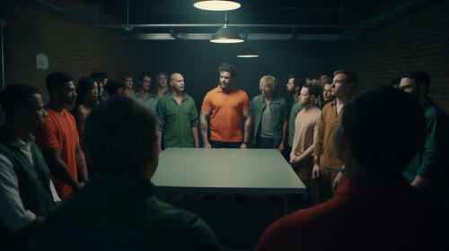 angry and sad community standing together in a 35mm film image only a few people and ensure they are diverse, v6