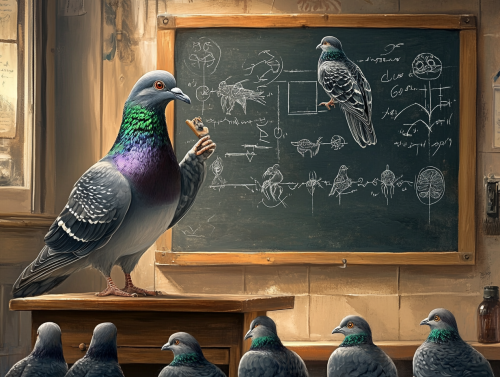 A pigeon standing by a chalkboard, holding a tiny pointer with feathers fluffed out, teaching other pigeons seated in a classroom. Blackboard has sketches of bird anatomy. --ar 4:3
