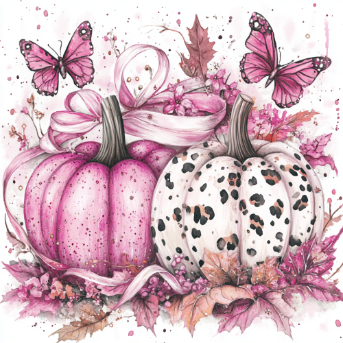 a whmsical watercolor illustration capturing the essence of a pink fall season, The central focus is on two uniquely displayed pink sparkly pumpkins, one sporting a leopard print pattern, the other a solid glittery cream, ribbons flow around it, Surrounding the pumpkins is a delightful array of pink butterflies in pink, cream and black hues. The background is filled with rich autumn colors, while the pumpkins are adorned with leopard print and cream ribbons, pink flowers, leaves and other decorative elements, The artwork is brought to life with an abundance of glitter and sparkles.