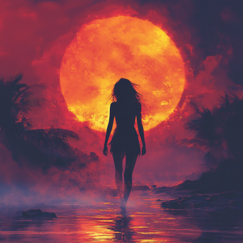 A silhouette of a girl walking against the backdrop of a vibrant sunset. The glowing sun is large and intense, casting deep reds, oranges, and purples across the sky. The girl’s body is shadowed, creating an abstract and atmospheric effect, blending into the sunset. The scene feels warm and mysterious, with a focus on the sun’s powerful glow. --s 750