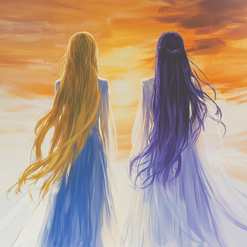 the view of the backs of two women walking towards a sunset. One has long golden hair, the other had long purple hair. Both are of a similar height. They are wearing long flowing dresses on white organza. In the style of an inspirational poster from the 1990s.