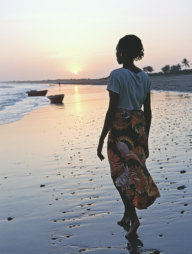 Dakar, Senegal, 1996, A young woman walking alone on a beach at sunset, barefoot in the damp sand, watching the warm colors of the horizon, peaceful and pensive Kodak UltraMax 400 --ar 3:4 --v 6.1