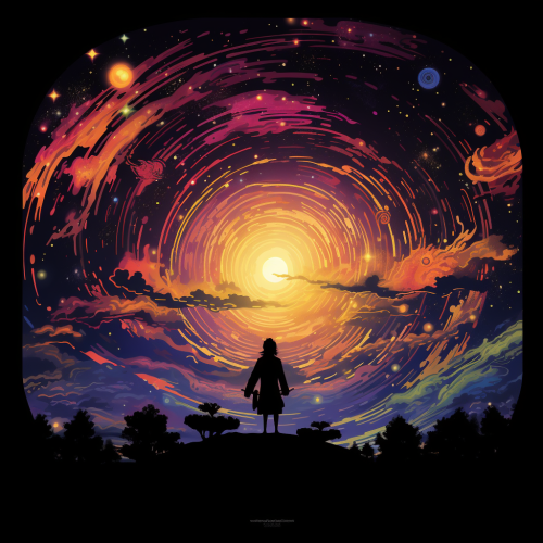 an alien sunset during a solar eclipse psychedelic stars race throughout the sky a silhouette of a wizard watches as he blows onto a pinwheel