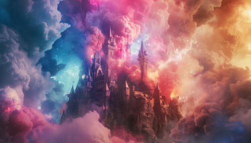 explosion of colors surrounding a medieval castle, magical, spells, wizards, photorelalistic --ar 7:4