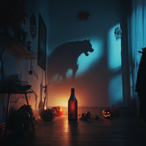 A lonely bottle stands in the centre of a dimly lit, minimalist room, surrounded by gloomy Halloween decorations. An eerie light from below casts a shadow that takes the form of a menacing werewolf - as if the bottle itself were the werewolf. The scene looks like a live-action horror film from 1987 with practical effects, nostalgic and intense, inspired by the aesthetics of a John Carpenter film in the 80s horror style. --style raw --s 50