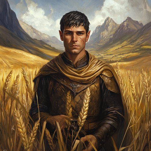 a portrait of a elvish dnd male soldier warlock with short dark hair standing in a wheat field with mountains in the background. 40 years old, tired, ugly