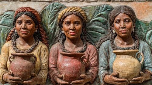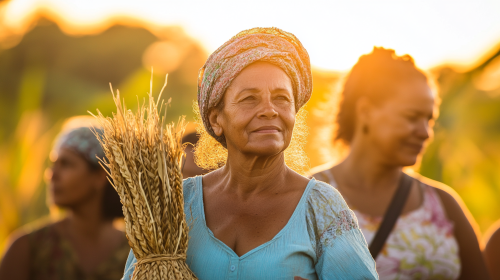 group of Brazilian women from the north of Brazil, these women wearing common clothes, a woman in the center holds a vase made of braided straw. nature background, warm colors, rays of light invade the scene, golden hour --ar 16:9