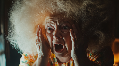 CLose up of a middle-aged, overweight, obese mother in 1982 with a big huge ugly wig and ugly early 1980s clothing is standing in shock screaming in fright with her hands on her face as she watches something in a room, her wig is starting to catch fire, stylish light and shadows --ar 16:9 --v 6.1 --style raw