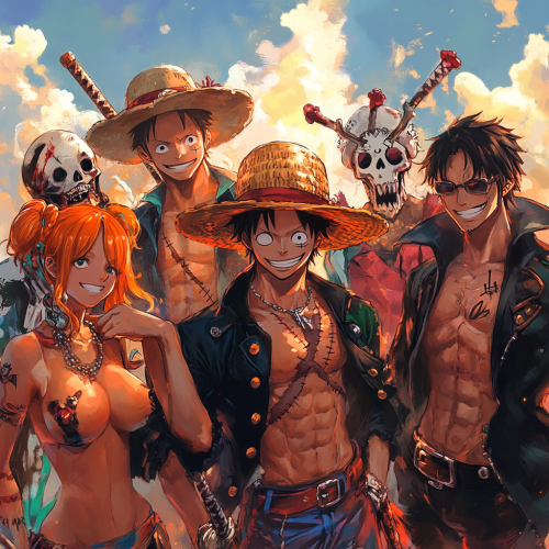 Straw Hat Crew, group shot, happy, smiling, Luffy with straw hat and scar under left eye, Zoro with bandanna and three swords, Nami with orange hair and staff, Sanji with suit and cigarette, Robin with dark hair and archeologist glasses, Franky with cyborg body and sunglasses, Brook with skeleton form and top hat, Chopper with reindeer form and medical hat, Usopp with long nose and captain outfit, sunny background, Thousand Sunny in the distance, vibrant colors, detailed expressions ra 1:1