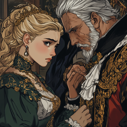 1500s. A young ugly princess dressed in manly attire, with golden hair and black eyes, glaring in a corner. At the center a king with silver hair holds the hand of a 14 year old beautiful princess who looks ashamed. Art, drawing, colour.