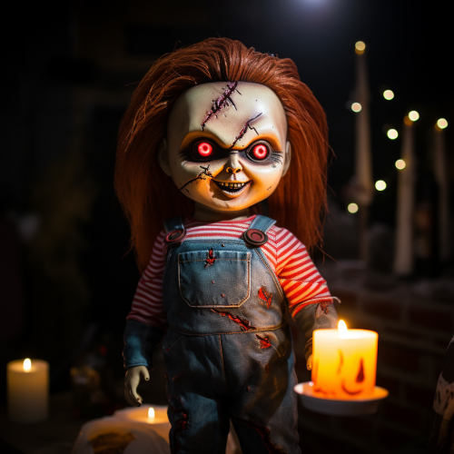 Chucky doll at the Halloween party with a pumpkin on her head with burning eyes --s 50