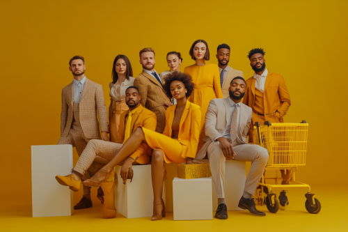 a photorealistic ultra-detailed business group photo in a deep yellow tone studio setting. 2 business women and 8 business men 10, wearing smart business outfits in different colour tones, no yellow outfits . In the setting there are 4 different shaped and sized white blocks and forms. There is still room between the people. People lean on the items, sit on them and everybody has an unique pose, not all face the camera. Energetic, happy. include a yellow shopping cart. Canon R5, 24-70 mm L II, 50 mm on F 6.3 --v 6.1 --ar 3:2