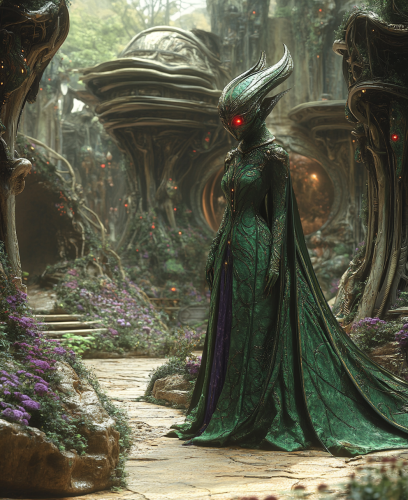 panavison 70 still, otherworldly queen dressed in green and purple garb standing in an alien world, red eyes, attire similar to moebius style, surreal, --s 300 --ar 9:11 --v 6.1