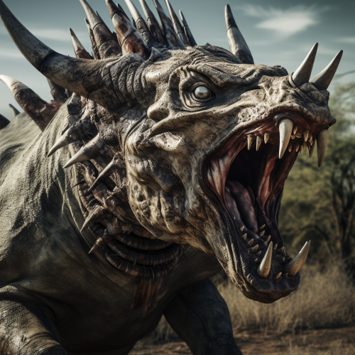 fujifilm photo of an alien tiger roaring in the african savannah , in the backround are rhinos, giraffes and a bear, HR Giger style, Cyberpunk, cinematic, epic, dramatic,