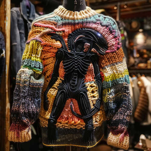 a jumper (sweater) with a movie scene from aliens h.r. giger. everything is knitted and colorful, but alien is black, --v 6.0