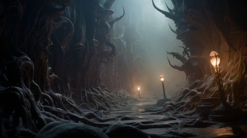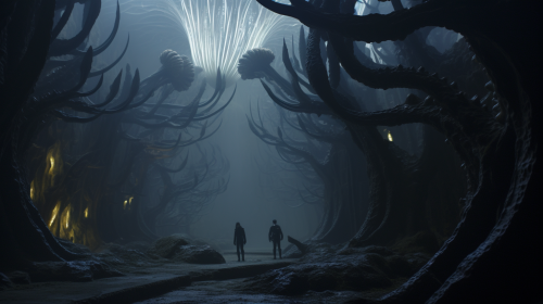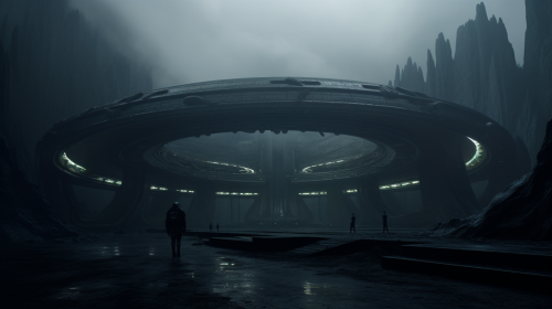 photorealistic movie still of the foggy approach to a creepy alien base in the underdark, hr giger design, menacing architecture, UHD 4K, cinematic lighting, hyperrealism, --ar 16:9 --v 5.2