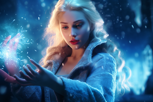 A spell comes out of the fingertips of Elsa, the Snow Queen. 3d, ultra hd, bright colors, realistic, 4k, wide angle, sharp colors, snow queen style --ar 3:2