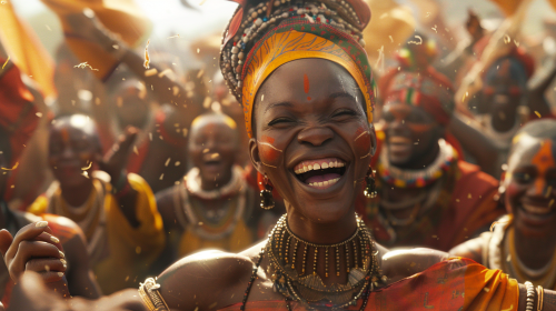 people smiles and cheers their 25 years old african queen during the day, realistic --ar 16:9 --v 6.0