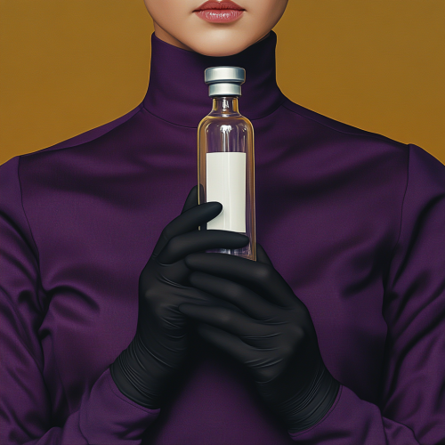 ultra-realistic nurse torso, light skin, only chin and lips visible, wearing dark purple medical scrub with high collar and long sleeves, with black gloves, holding with only hand a big transparent glass vial, with white empty label on it, gold background with no pattern