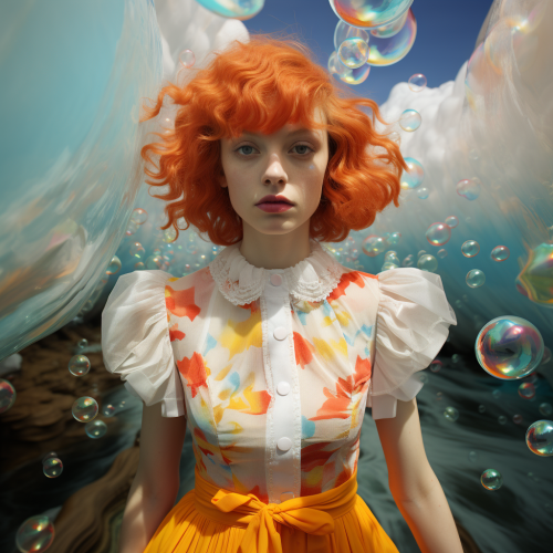 **a photo of It's a foggy and overcast day. on the beach by the sea. There are small puddles on the sand. woman wearing a pleated white dress, elegant , photorealistic, ultra-realistic, ultra-detailed , vivid color , photography, pose, cindy sherman:: anna stokes, vibrant color, surreal , close-up , --s 250