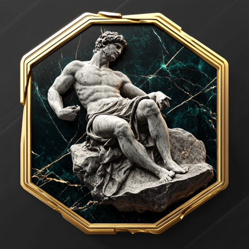 A hexagonal badge with a ridged gold outline, featuring a hyper-realistic digital achievement icon. The badge showcases a greek statue that is supporting someone who has fallen down, lifelike sitting slightly outside the badge, adding a dynamic 3D effect. The statues display finely detailed textures on the marble surface, with gold highlights fitting a modern, gritty, and bold aesthetic. The scene is defined by dark tones with striking teal accents, while the statues are captured as if through a 35mm lens for a hyper-realistic, contemporary edge. The background contrasts the badge.