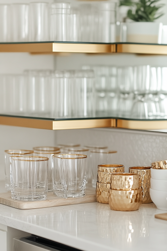 Create an image of a luxe gold accents kitchen where gold hardware on cabinets, gold light fixtures, and even gold-accented furniture add a touch of opulence. The background could be in soft whites or greys to let the gold shine, with a high-end white marble countertop adding to the luxurious feel. Details like gold-rimmed glasses on open shelving or a gold faucet can tie the theme together. This kitchen should look rich and sophisticated, a perfect blend of modern luxury and classic elegance. This photo should be so stunning and refined that it encourages viewers to explore luxe gold kitchen ideas. Neat and organized. Camera: DSLR - Canon EOS 5D Mark IV. Lens: Canon EF 24-70mm f/2.8L II USM. Composition: Wide shot, room-centered, horizontal orientation, balance between furniture and space. Film: Digital, high resolution, color profile sRGB. Camera settings: ISO 400, f/2.8, 1/60 sec. --ar 2:3 --v 6.1 --s 250