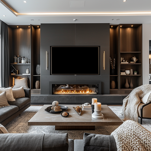 luxury modern organic outdoor kitchen. With a garden. Black lined windows. Olive green bottom with white marble island. Cream upper cabinets. Deep Olive green lower cabinets. Minimalist abstract charcoal green cream vintage art above stove range. Wall sconces. 2 rust orange modern Accent bar chairs. tall large vase of eucalyptus flowers. Dark brown oak floors. Modern round pendants. Layer the room with accent pieces. Realistic style --ar 1:1 --v 6.0 --s 250 --style raw