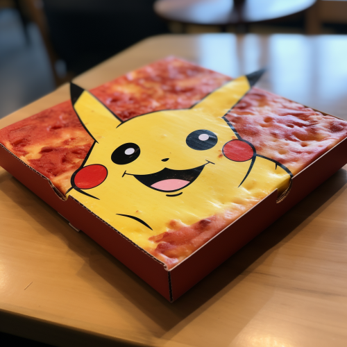 a red baron pizza box. The flavor is "grilled pikachu" and there is an image of a sad pikachu on the box.