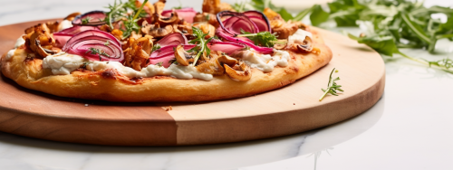 healthy pizza, button mushrooms, tomato sauce, burrata, arugula, red onions, photography for a cook book, 30 degree shot, light background, marble tabletop, beautiful soft lighting --no dark background, spoon, fork, knife --v 5.2 --ar 16:6