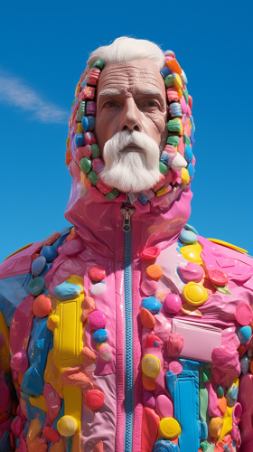 cinematic wide angle, frontal, sam elliott standing frontal, clothed in colorful pez candy suit, background landscape covered in different kinds of huge candy, yellow, light blue and pink colors --ar 9:16