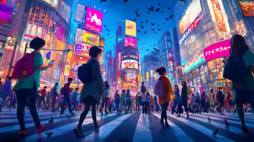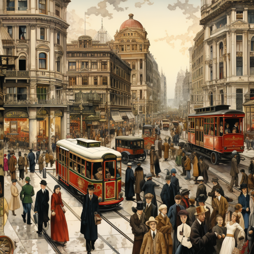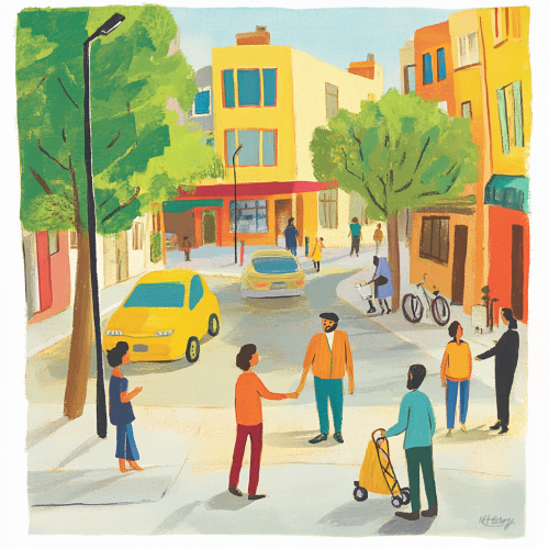 A bustling urban street scene, where various people are engaged in everyday activities, such as helping each other, making wise choices, and demonstrating common sense. The atmosphere is lively and positive, with bright colors and a sense of community. --chaos 10