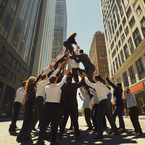 A photorealistic image of a group of people in professional business attire creating a human pyramid in the middle of a busy downtown street. High resolution. Photorealistic.
