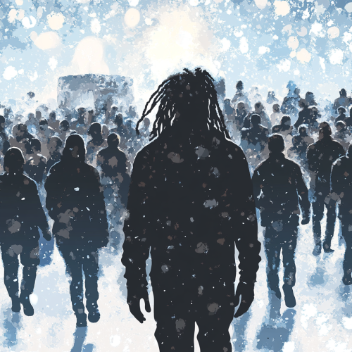 a realistic crowd of busy people minding their business while they are walking to their destination with smiles on their faces. There is also an obvious dark silhouetted African America male Slightly overweight with a height of 6’2 with 14 inch dreadlocks in the middle of the all the chaos, seemingly keeping his distance from the crowd with a snowing cloud on top of his head.