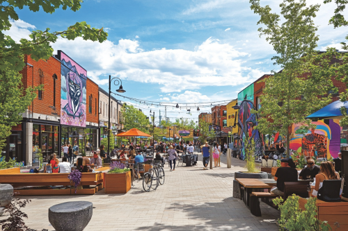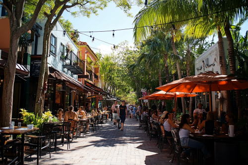 A street view featuring local galleries, boutique shops, and bustling eateries with people enjoying outdoor dining, capturing the cultural hub's vibrant atmosphere. --ar 3:2
