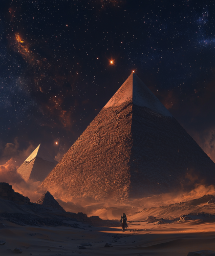 As the golden sun set behind the majestic pyramids of Giza, the vast desert began to cool under the soft blanket of night. The stars twinkled like tiny gems scattered across the dark sky, watching over the land of Egypt, --ar 16:19 --q 2