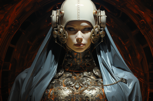 An alien with large black eyes and a big oval head and pale skin wearing robes and space armor in a futuristic city, realistic hyper-detail, dark gothic, saturated pigments, cross-processed film, illustrated by frank frazetta --ar 3:2 --s 750 --v 5.2