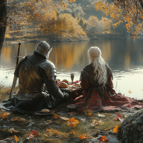 high fantasy style. A Medieval knight and his lady having a picnic beside a lake on a sunny, beautiful fall day. They stare into each other’s eyes lovingly.